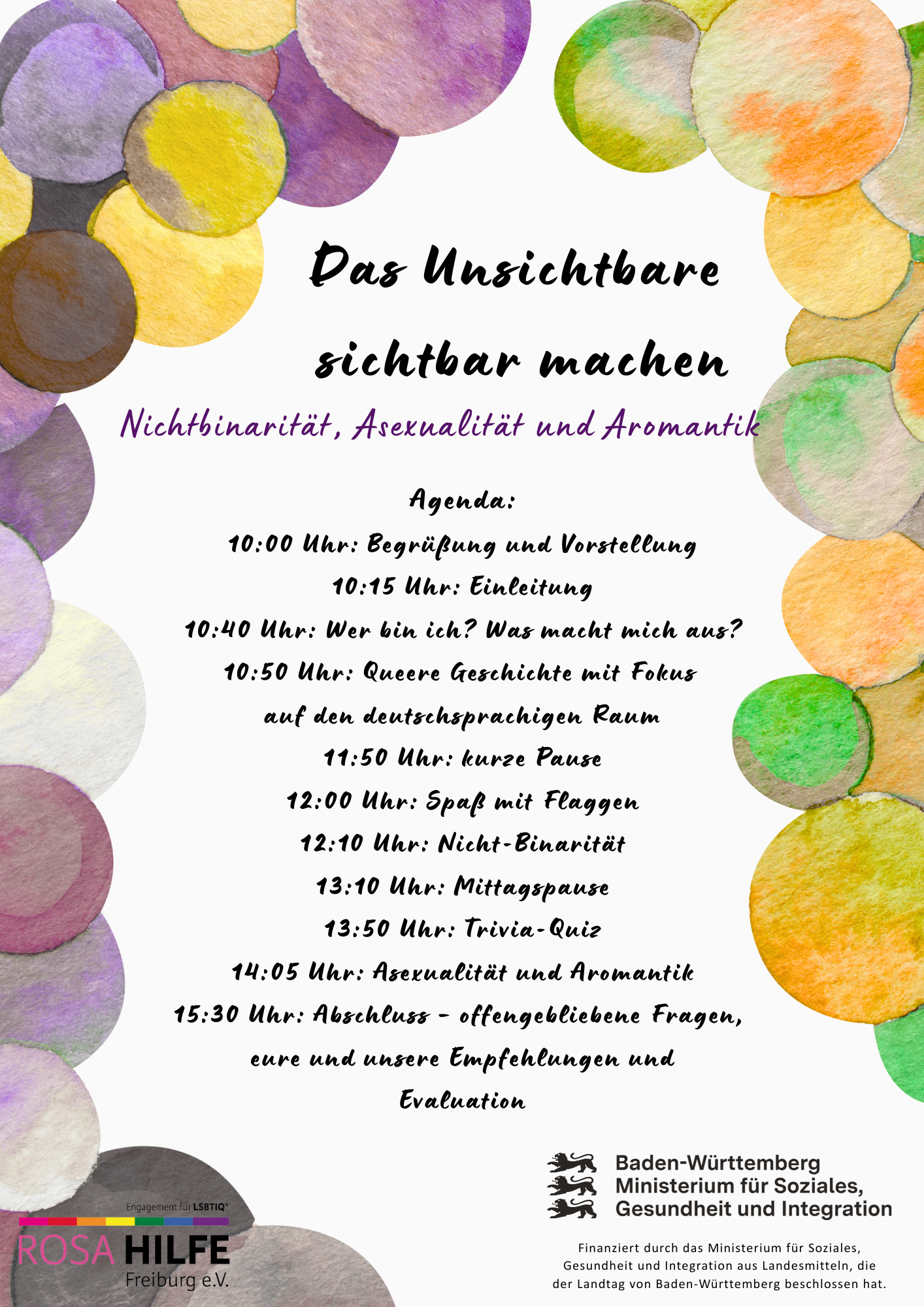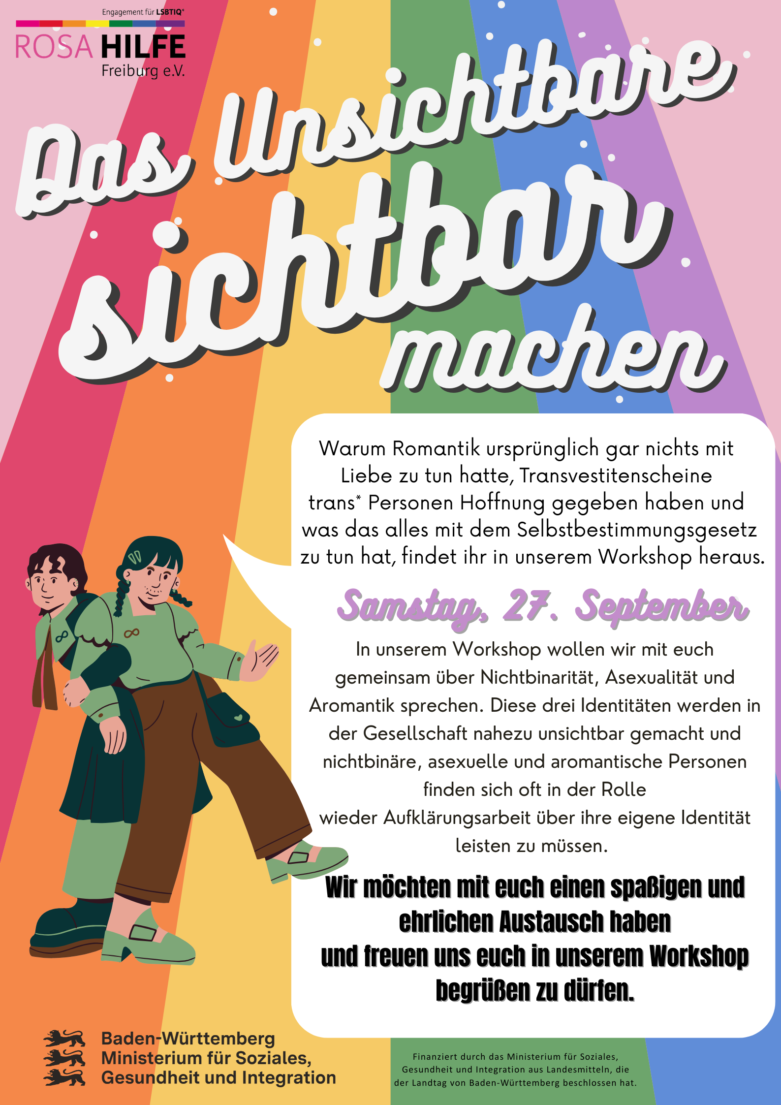 Warum Romantik ursprünglich gar nichts mit Liebe zu tun hatte, Transvestitenscheine trans* Personen Hoffnung gegeben haben und was das alles mit dem Selbstbestimmungsgesetz zu tun hat, findet ihr in unserem Workshop heraus. Wir wollen mit euch gemeinsam über Nichtbinarität, Asexualität und Aromantik sprechen. Diese drei Identitäten werden in der Gesellschaft nahezu unsichtbar gemacht und nichtbinäre, asexuelle und aromantische Personen finden sich oft in der Rolle wieder Aufklärungsarbeit über ihre eigene Identität leisten zu müssen. Mithilfe historischer Einordnungen möchten wir euch die Lebensrealitäten dieser drei Identitäten näherbringen, sowie Veränderungen im Laufe der Vergangenheit bis heute thematisieren.